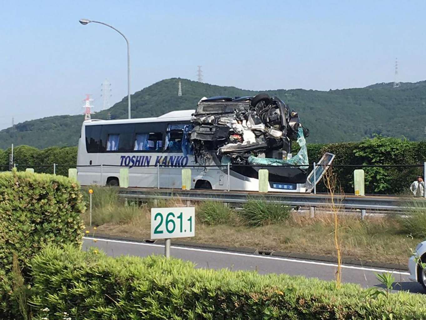 The damaged bus after a passenger car crashed into it on the Tomei Expressway in Shinshiro, Aichi Prefecture on June 10, 2017.