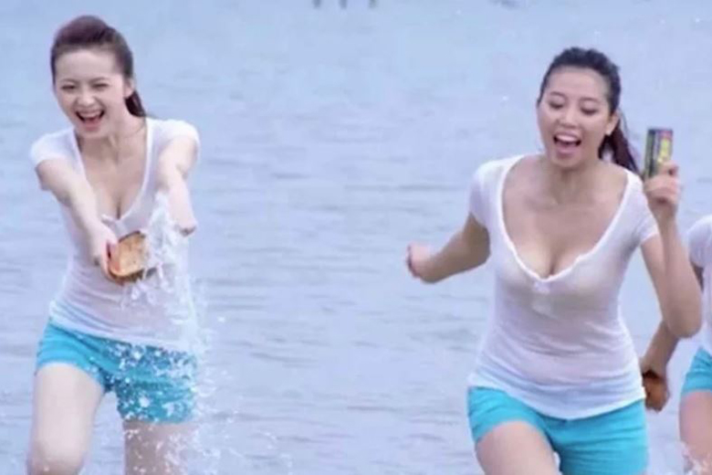 A television commercial features several women with big breasts wearing tight tops and frolicking on a beach.