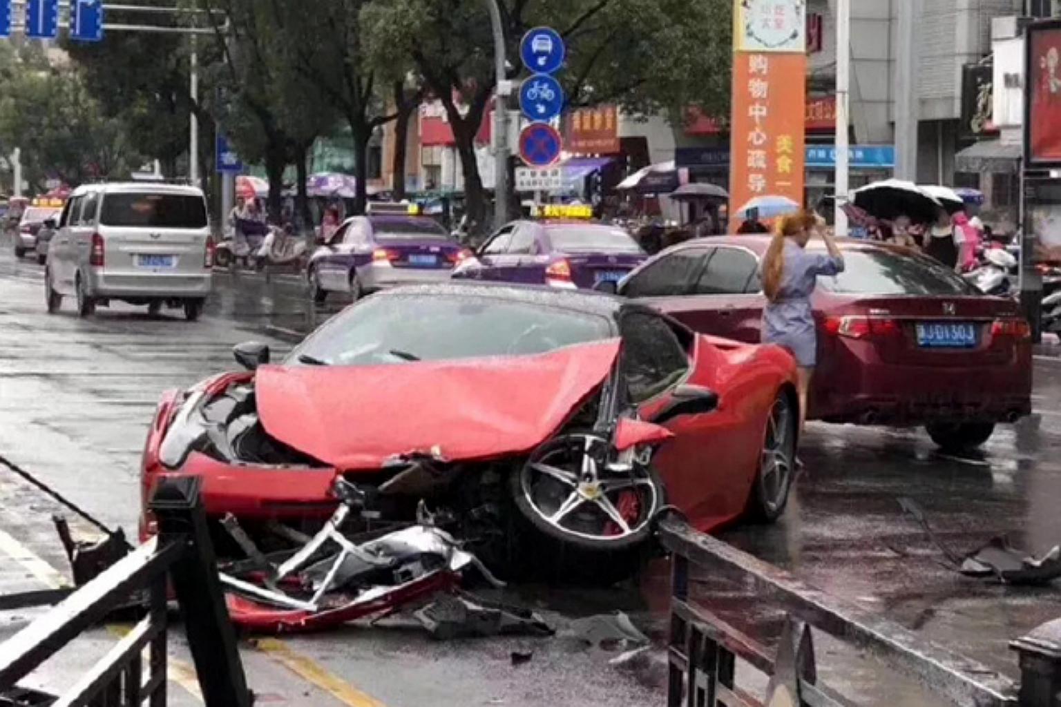Photos circulating on Chinese social media platform Weibo showed the Ferrari 458's front bonnet severely damaged, and one of its front wheels dislodged.
