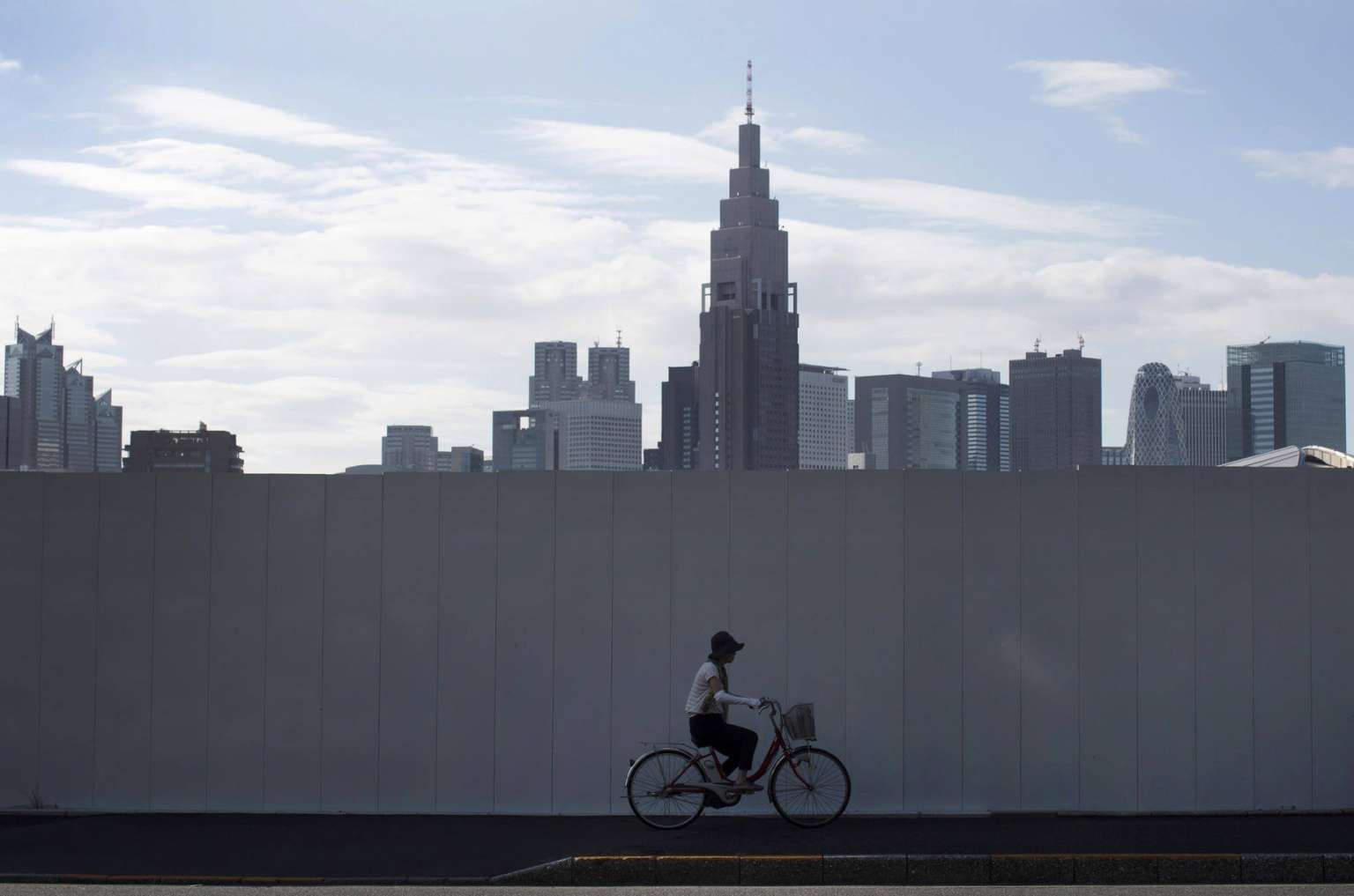 A woman rides a bicycle past the construction site of the new National Stadium as buildings stand behind the site in Tokyo, Japan, on Sept 3, 2016.