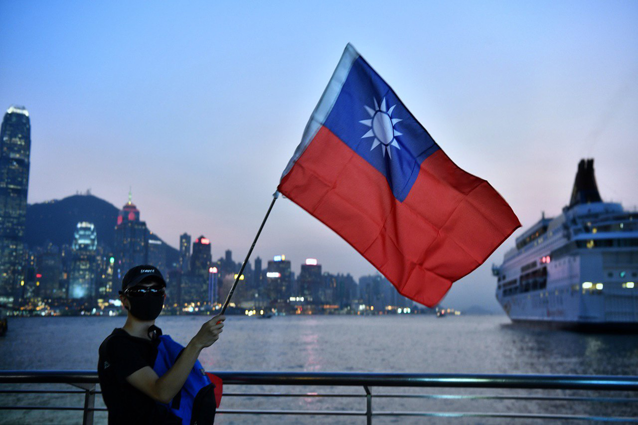 A photo taken on Oct 10, 2019, shows a protester waving the Taiwan flag in Hong Kong.