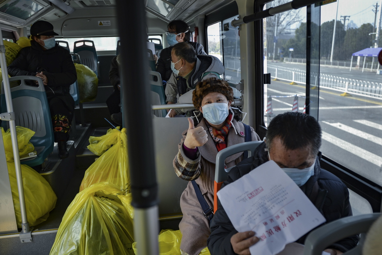 A photo taken on Feb 22, 2020, shows recovered Covid-19 patients, just discharged from a temporary hospital, riding a designated bus to another quarantine facility in Wuhan, China.