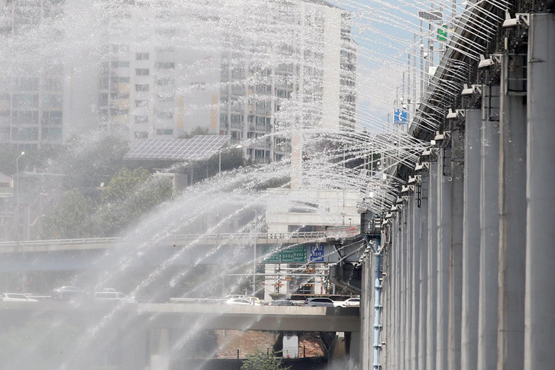 Water is sprayed amid sweltering heat at the Banpo Bridge over the Han River in Seoul on July 30, 2018.
