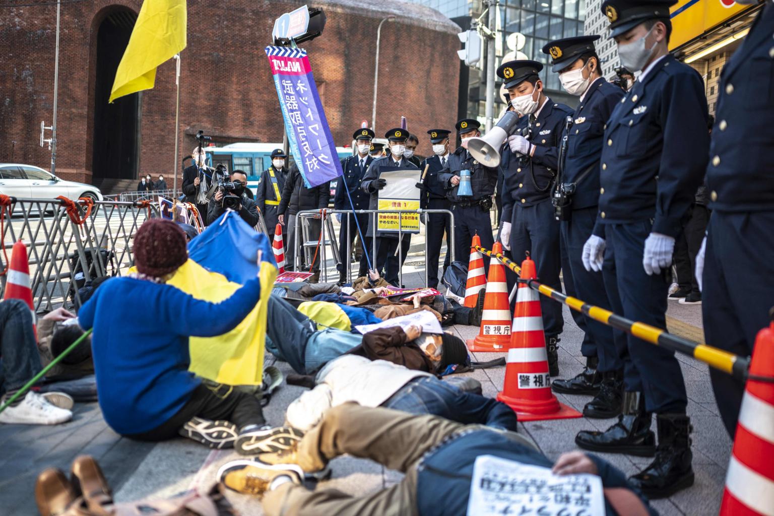 Activists taking part in a demonstration near the Russian embassy in Tokyo on March 10, 2022.