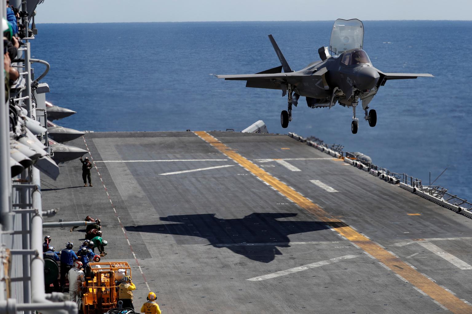 A stealth fighter pilot prepares for a vertical landing aboard the USS Wasp amphibious assault carrier in the waters off Okinawa, on March 23, 2018.