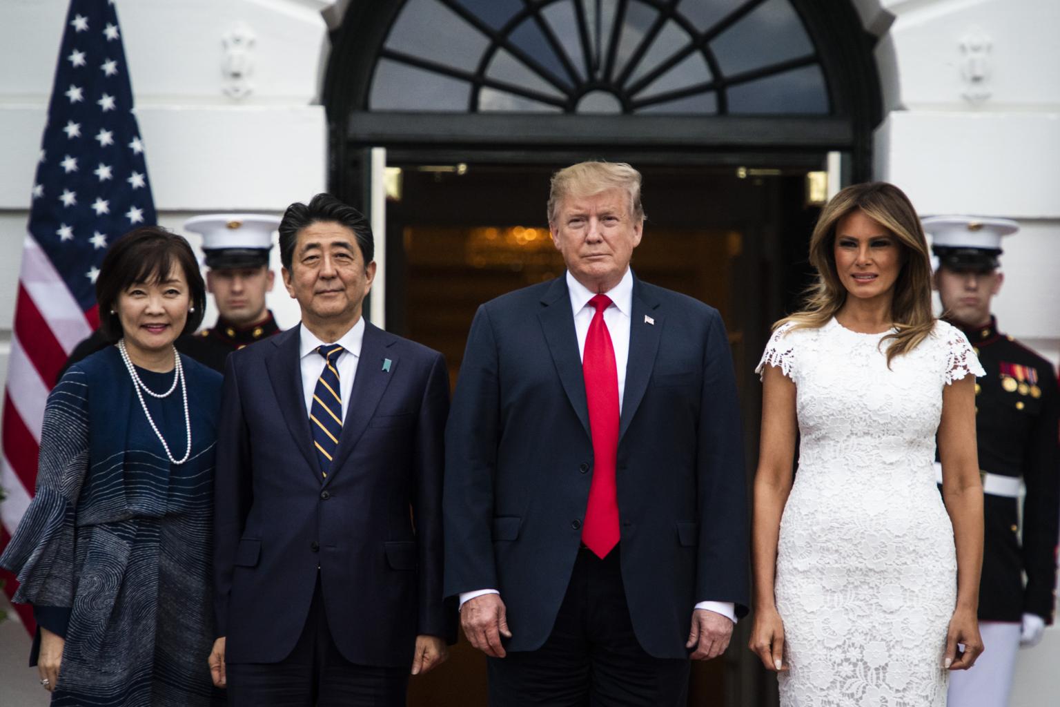 US president Donald Trump and first lady Melania Trump welcome Japanese prime minister Shinzo Abe and his wife Akie Abe outside the South Portico at the White House in Washington on April 26, 2019.