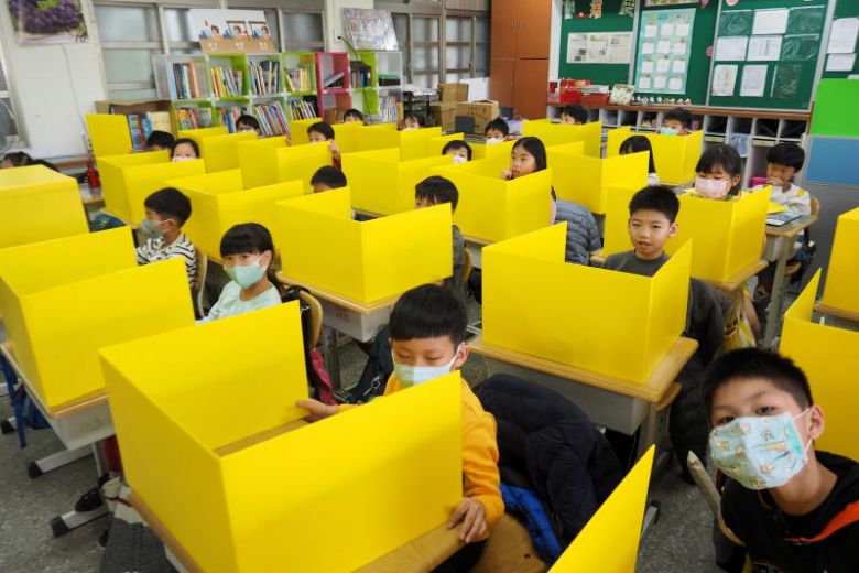 Pupils, some wearing masks, sit behind partition boards as they attend classes at Dajia Elemental School in Taipei, Taiwan, on March 3, 2020. The school prepared the boards, made with PP Corrugated Board, to prevent infection of Covid-19 by saliva when pupils talk, cough, sneeze or have lunch in the classroom.