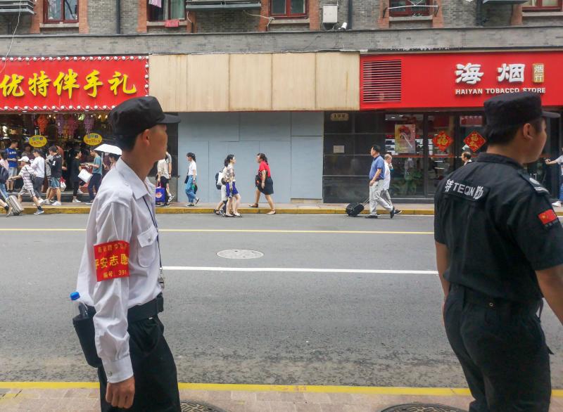 Security personnel near the site where a shop signboard fell onto the street, killing people the night before, in Shanghai, on Aug 13, 2018.