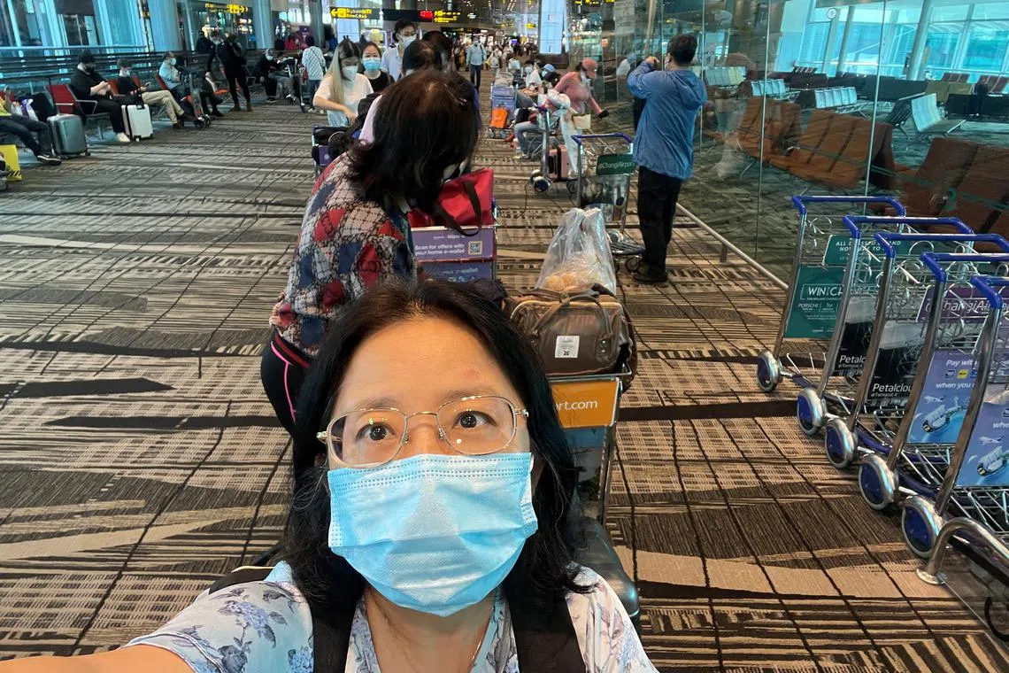 Ms Chu Wenhong poses for a selfie before boarding her flight to China ahead of Chinese New Year, her first time going home since the Covid-19 pandemic erupted.