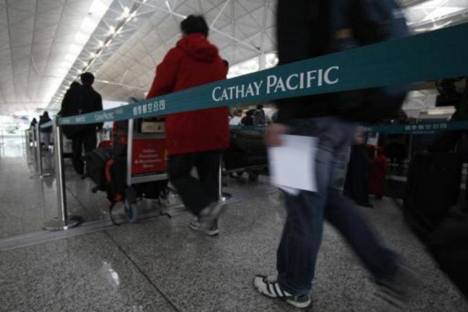 Passengers queue up at a Cathay Pacific check-in counter in Hong Kong Airport March 10, 2010.