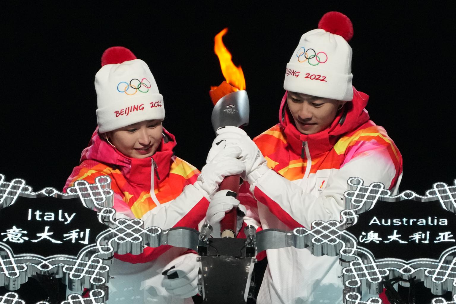 Dinigeer Yilamujiang, from Altay in China's western Xinjiang region, placed the lit torch onto a giant snowflake along with Zhao Jiawen, a 21-year-old biathlete, before it was lifted high above the spectators at Beijing's Bird's Nest stadium.