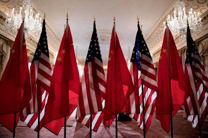 US and Chinese flags are seen as Secretary of State Mike Pompeo and China's Foreign Minister Wang Yi meet at the US Department of State in Washington, DC, on May 23, 2018.
