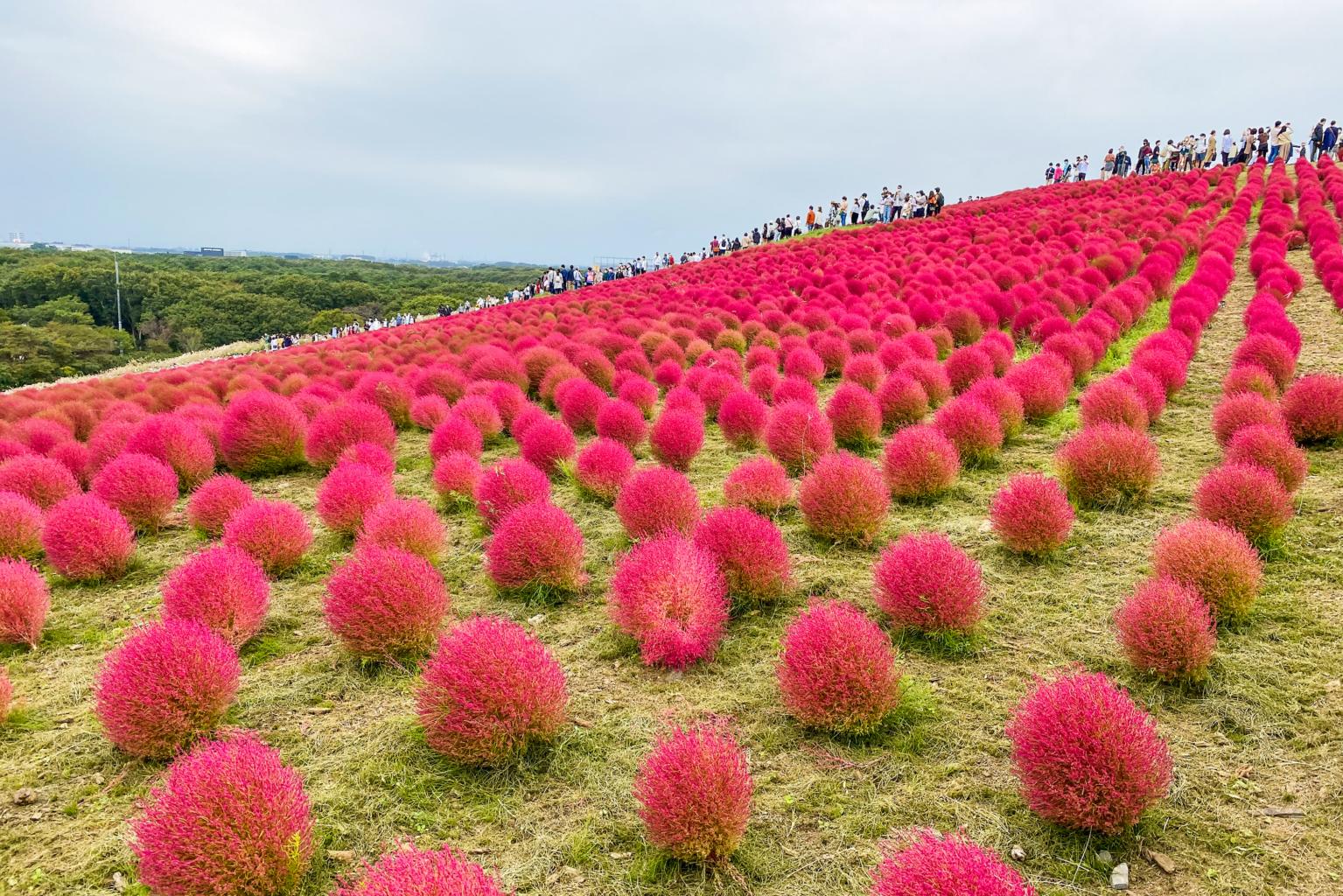 Kochia bushes turn a bright scarlet in October and have proven a draw for tourists to the Hitachi Seaside Park in Ibaraki Prefecture every autumn.