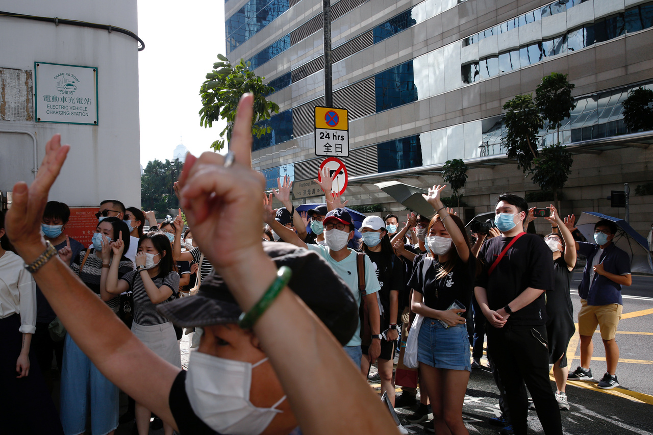 <p>Supporters raise their hands up symbolising of the "Five demands, not one less" to bid farewell to a prison van after an anti-government protester Sin Ka-ho has been sentenced four years for rioting, in Hong Kong, China May 15, 2020. REUTERS/Tyrone Siu</p>