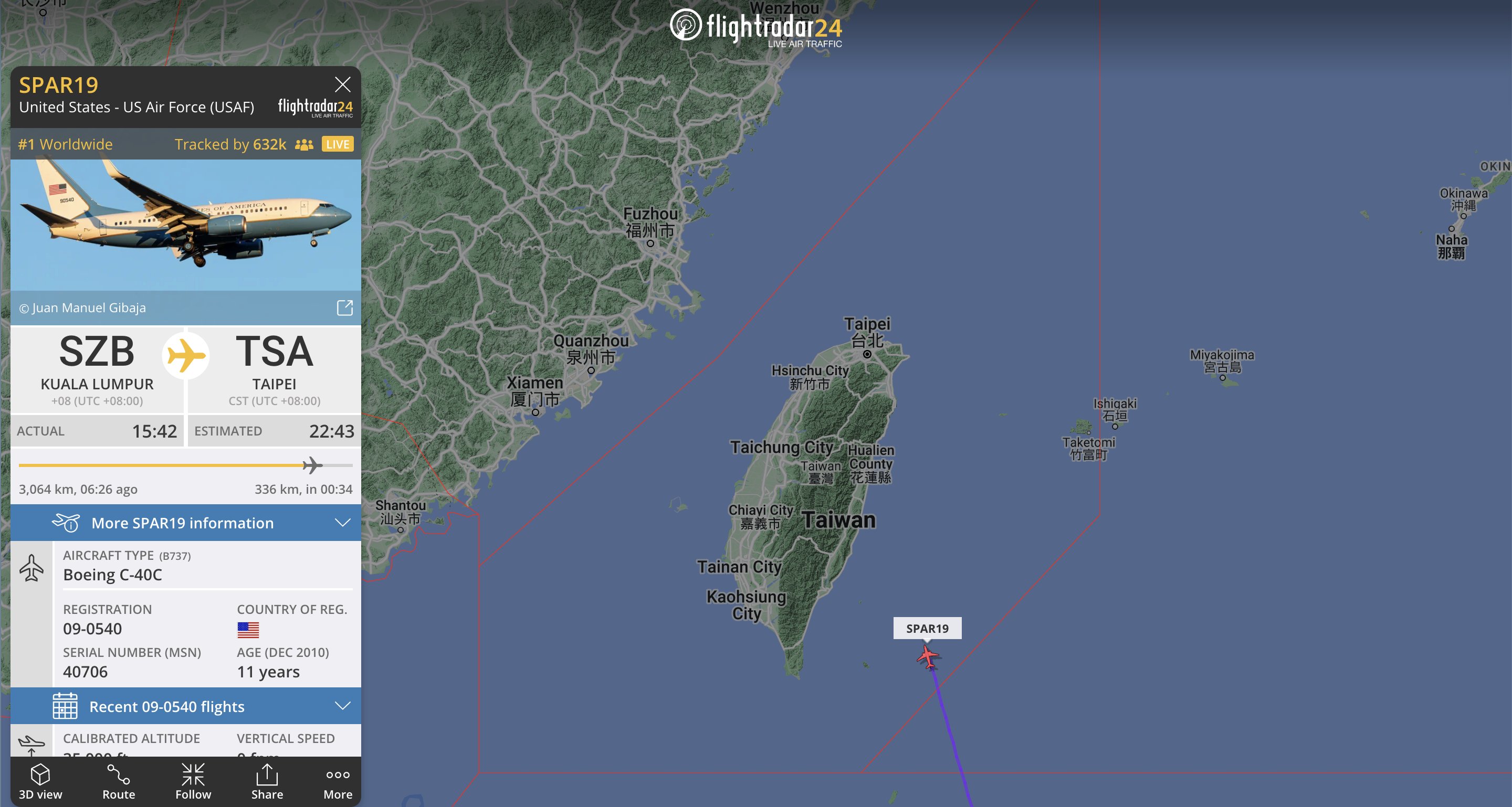 An image sent out on Twitter by Flightradar24, letting users know that Nancy Pelosi's plane was in Taiwan's airspace.