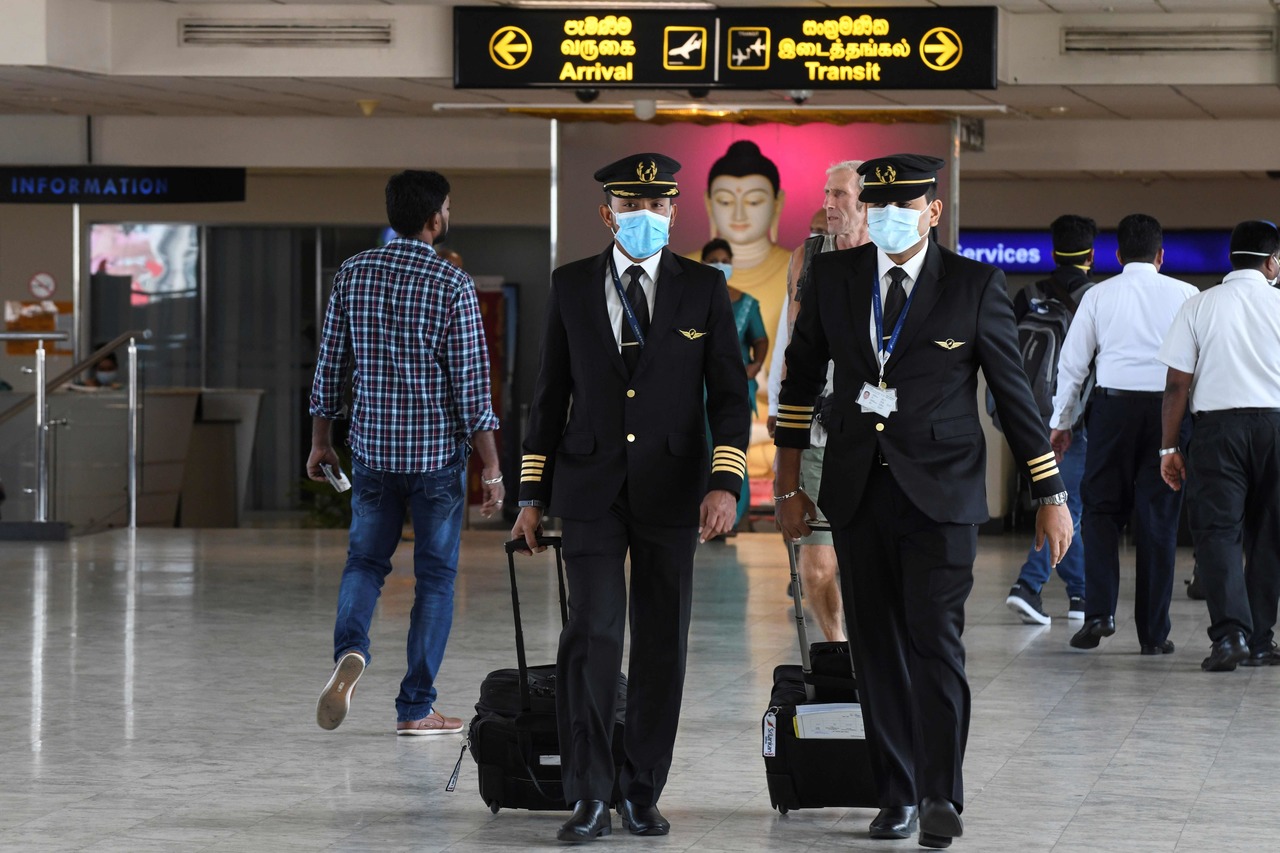 In a photo taken on Jan 30, 2020, pilots with protective face masks walk at Bandaranaike International airport in Katunayake, Sri Lanka.