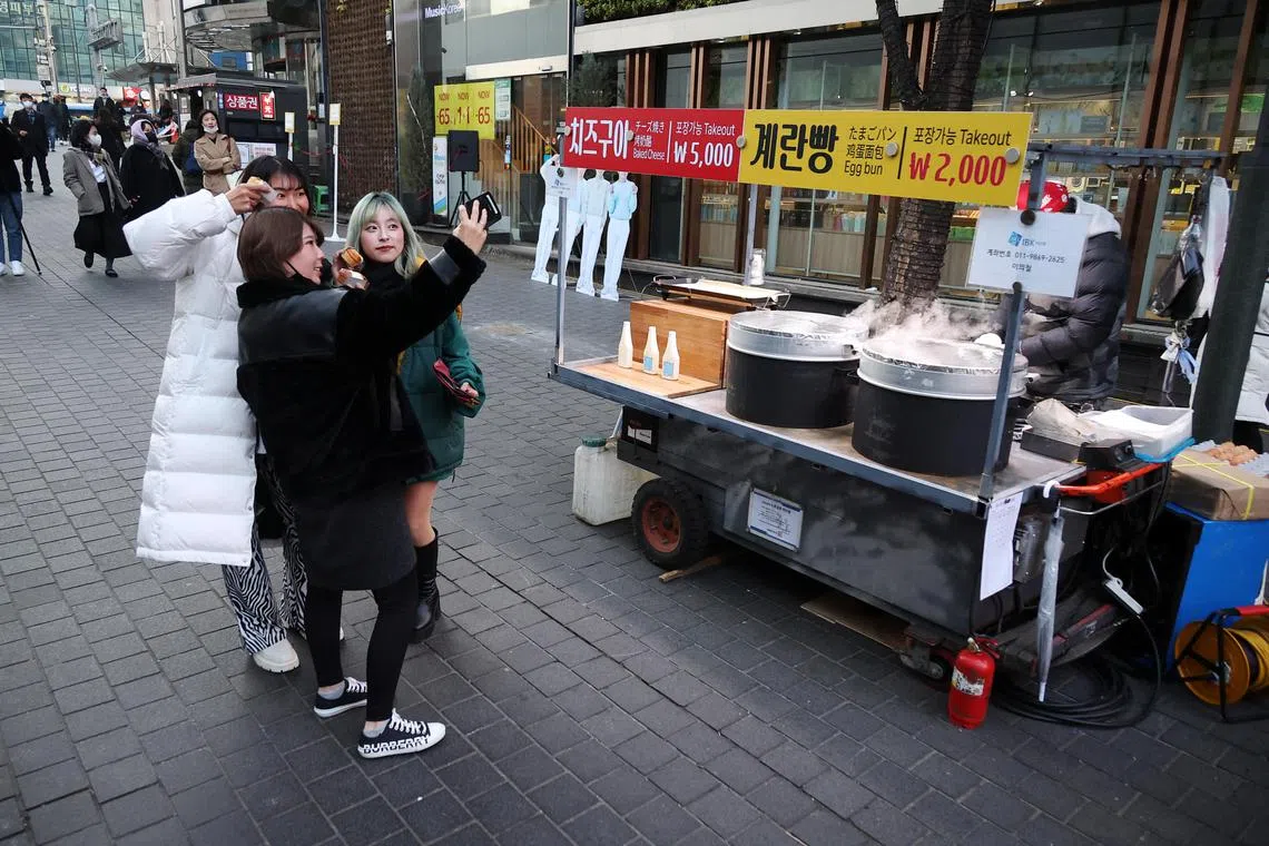 Tourists taking a selfie next to a street vendor at the Myeong-dong shopping district in Seoul, on Jan 9, 2023.
