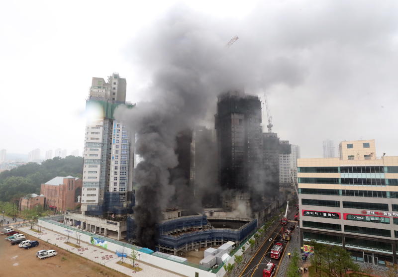 Smoke engulfing an apartment building construction site after a fire broke out in the administrative town of Sejong, South Korea, on June 26, 2018.