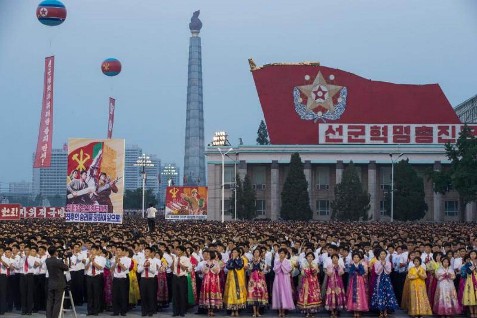 Participants stand in formation during celebrations marking the July 4 launch of the Hwasong 14 intercontinental ballistic missile, in Pyongyang on July 6, 2017.