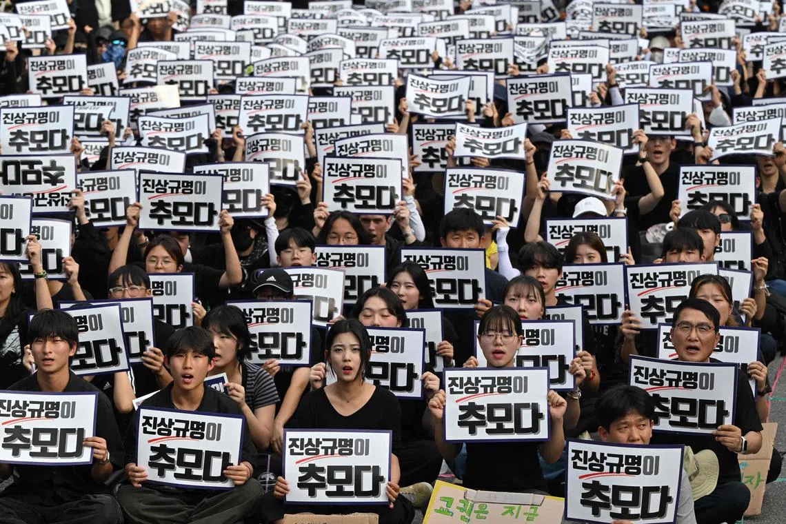 Protesters holding up signs reading “Revealing the truth is the way to pay respect” during a rally demanding the protection of teachers’ rights in front of the National Assembly in Seoul on Sept 4.