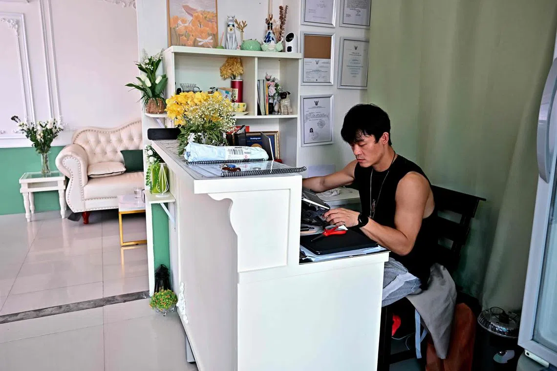 Mr Yin Wenhui, 31, taking care of guest bookings at the hostel where he works in the northern Thai city of Chiang Mai.