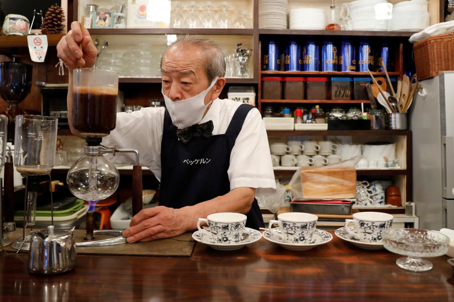 Mr Shizuo Mori, the owner of Heckeln coffee shop brews coffee at his shop in Tokyo on Oct 8, 2021.