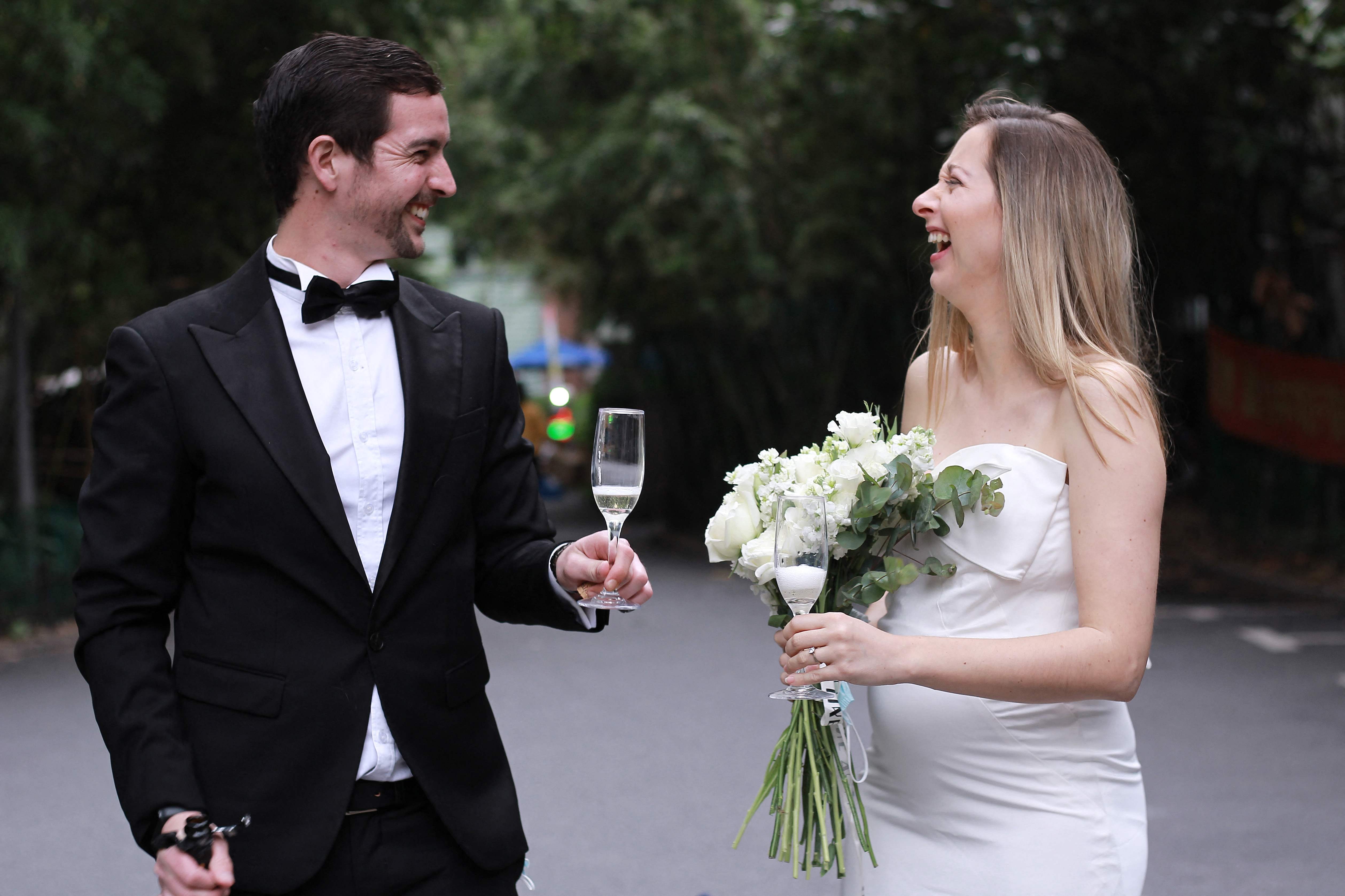 Mr Matthew Mitchener (left) and Ms Janelle Nuyts celebrating their wedding in the car park of their housing compound in Shanghai on April 30, 2022.