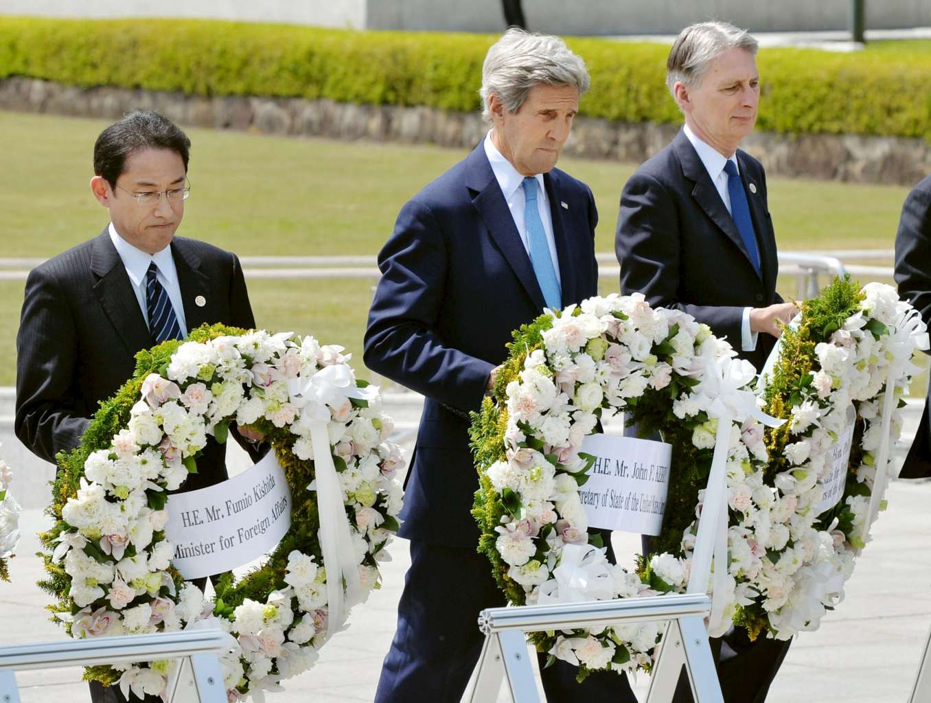 US Secretary of State John Kerry (centre) preparing to lay a wreath at the cenotaph with Japan's Foreign Minister Fumio Kishida (left), Britain's Foreign Minister Philip Hammond and other G-7 foreign ministers at Hiroshima Peace Memorial Park and Museum in Japan on April 11, 2016.
