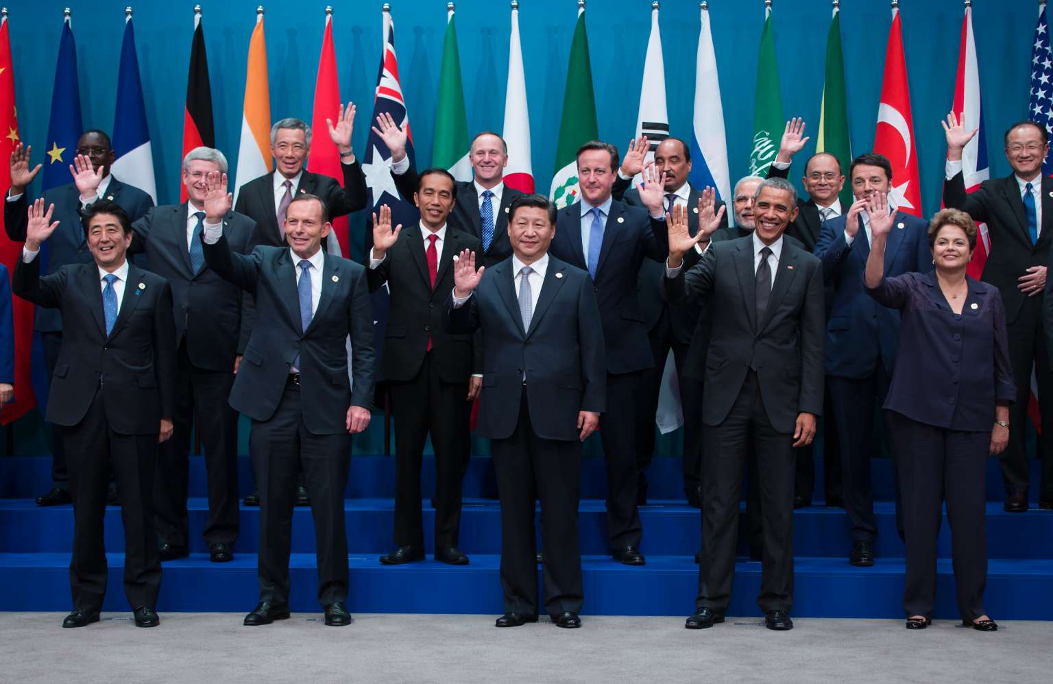 World leaders and delegates wave as they pose for a family photograph at the Group of 20 (G-20) summit in Brisbane, Australia, on Nov. 15, 2014.