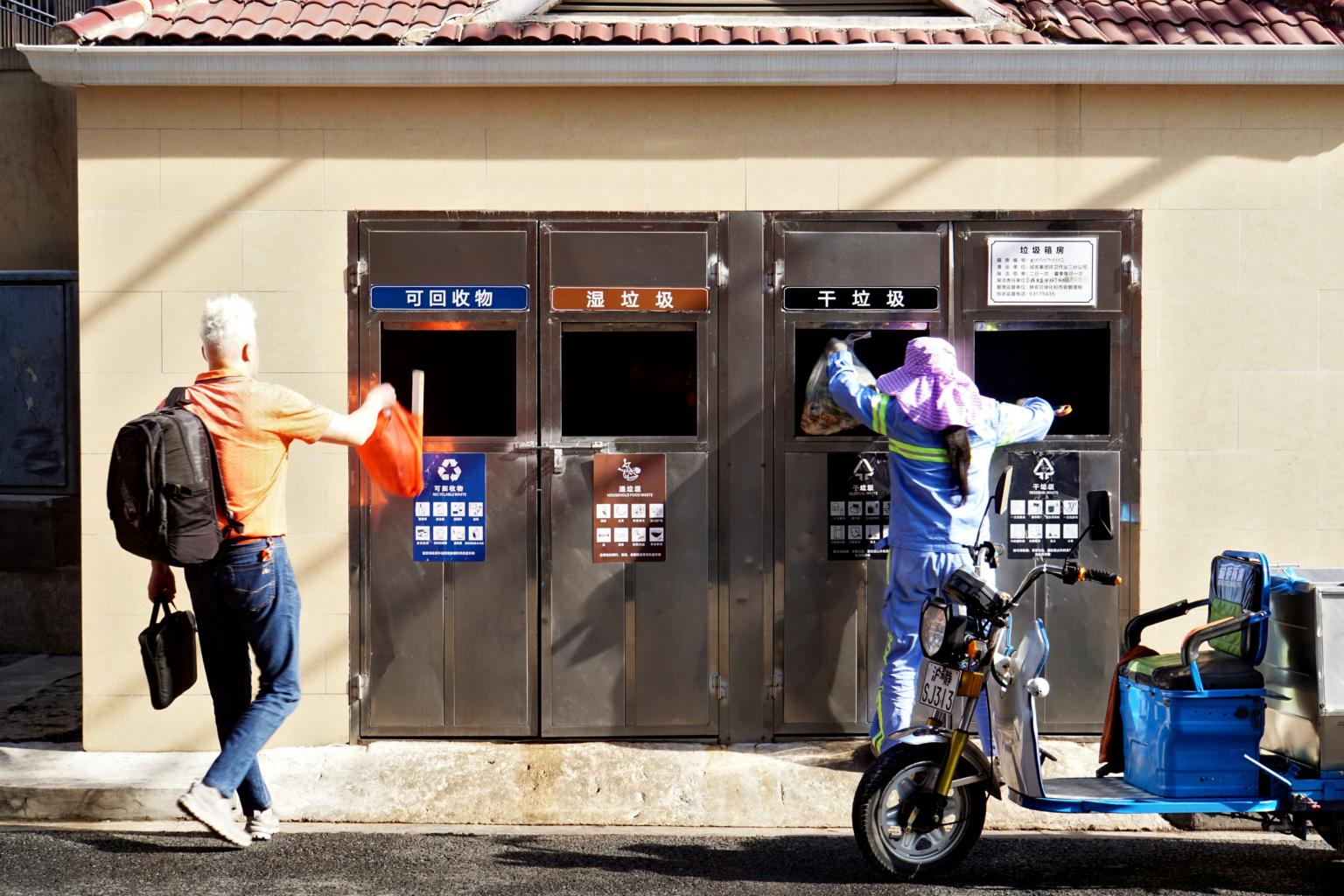 A man and a cleaner throwing trash at a waste collection point in Shanghai, China, on May 24, 2019.