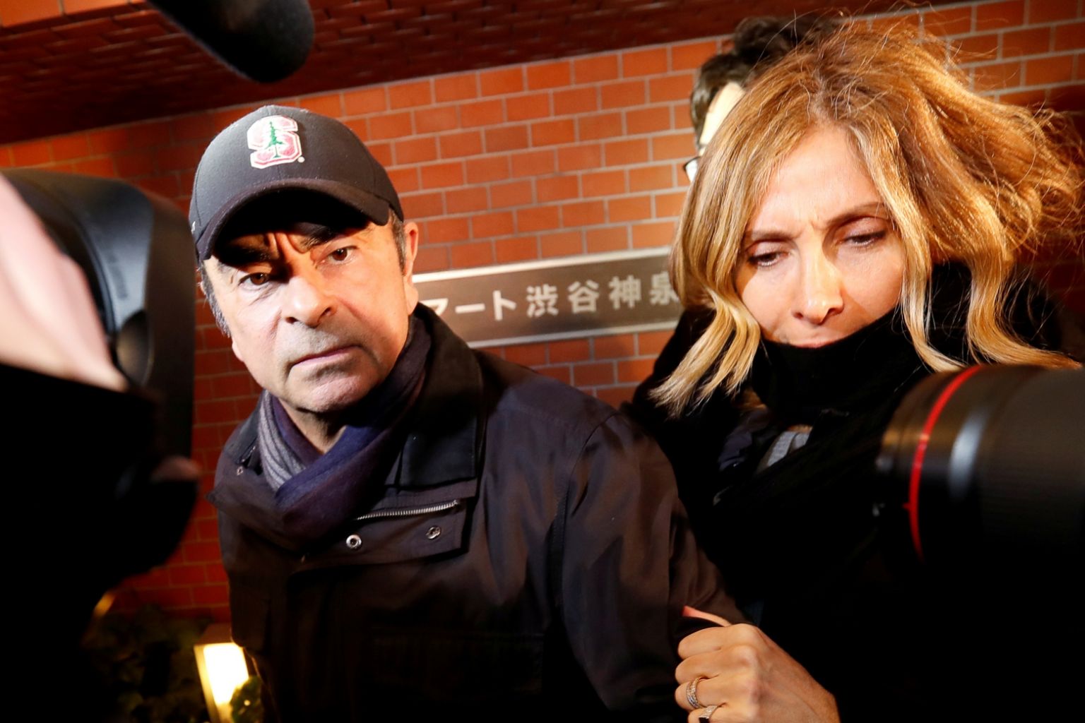 Former Nissan Motor chairman Carlos Ghosn, accompanied by his wife Carole, arriving at his place of residence in Tokyo on March 8, 2019.