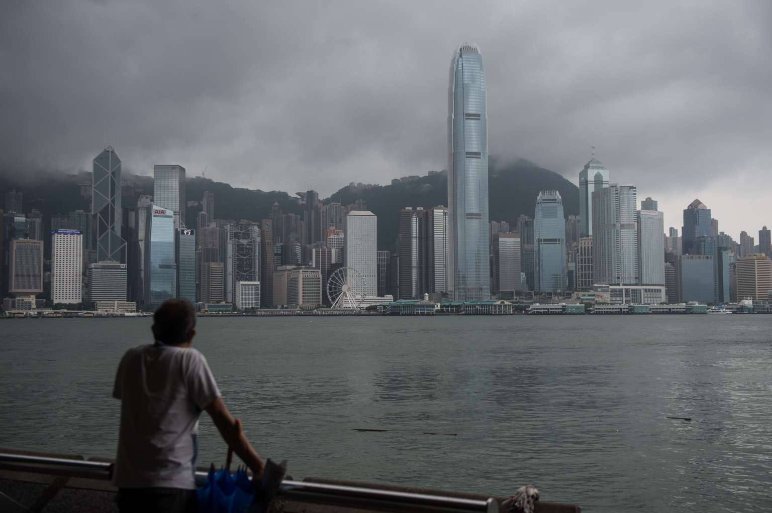 A man looks out towards the Hong Kong skyline, as storm clouds pass on Aug 2, 2016.