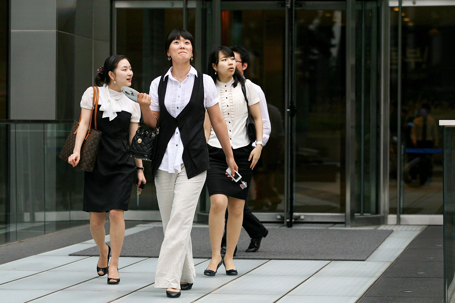 Businesswomen leave an office building in downtown Seoul.