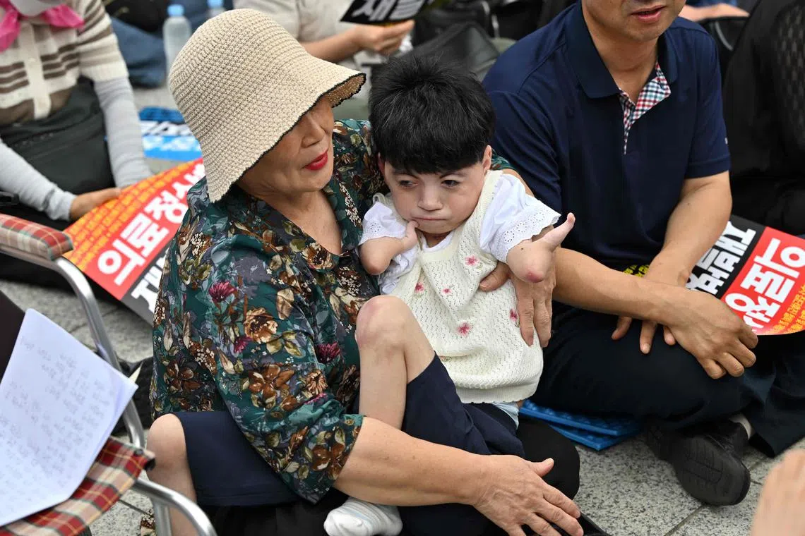 Miss Park Ha-eun, a 23-year-old South Korean patient with Cornelia de Lange Syndrome, being carried by her mother Kim Jeong-ae, at a rally against doctors’ strike in Seoul on July 4.