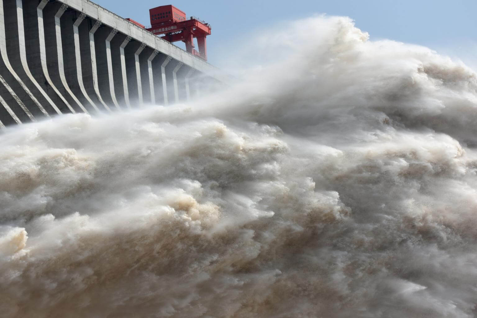 The Three Gorges Dam on the Yangtze River discharging water on July 15, 2018, to lower the water level in the reservoir, following heavy rain and floods across the country.