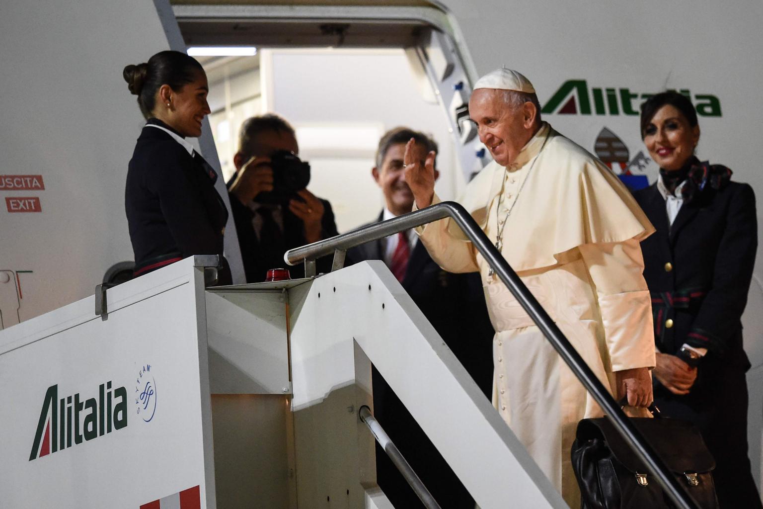 Pope Francis boards his plane at Rome's Fiumicino airport on Nov 19, 2019, to depart for a one-week trip to Thailand and Japan. The song, "Protect all Life - The Signs of the Times", is based on the theme of the Pope's Japan visit.