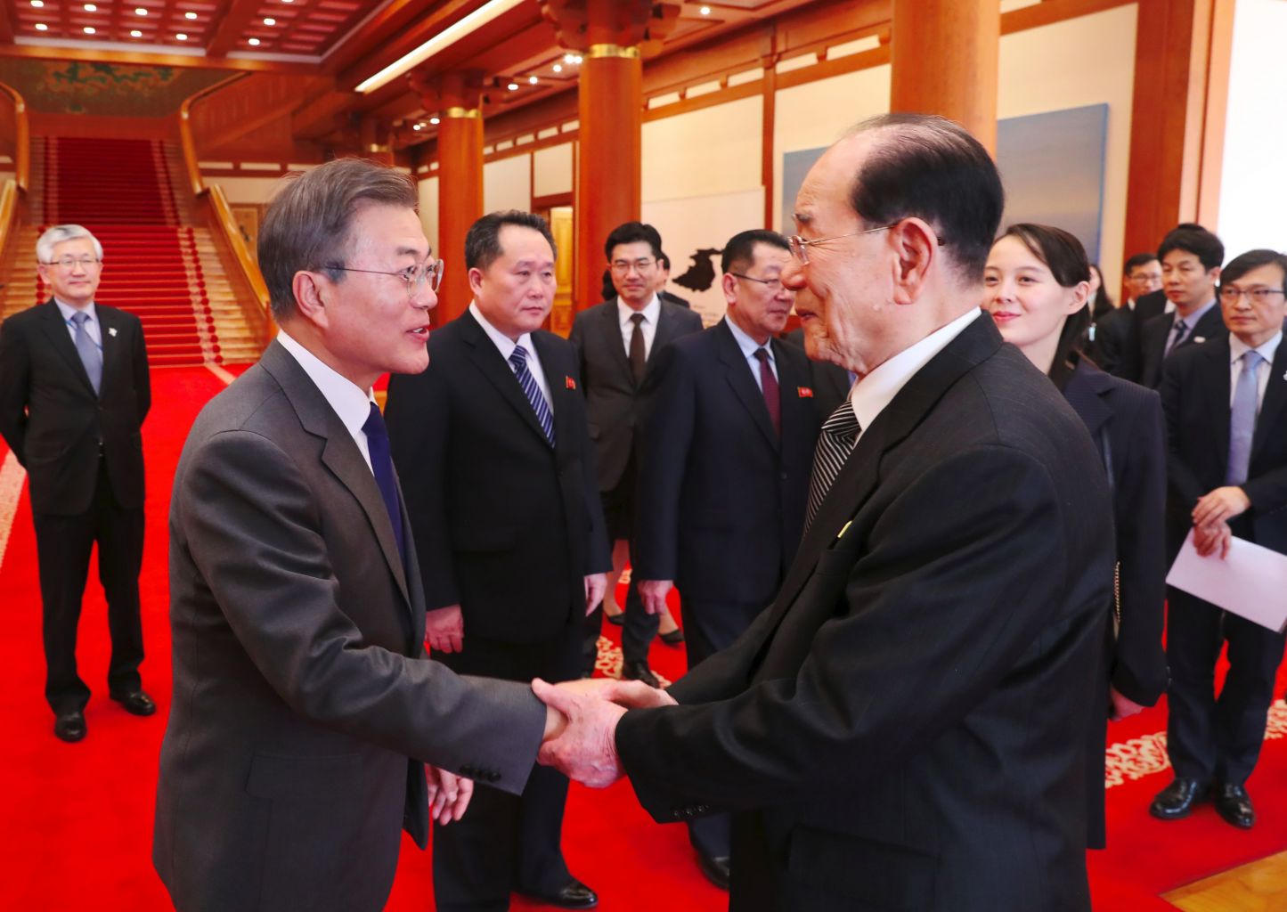South Korea's President Moon Jae In (left) greets North Korea's ceremonial head of state Kim Yong Nam before their meeting at the Blue House in Seoul, on Feb 10, 2018.