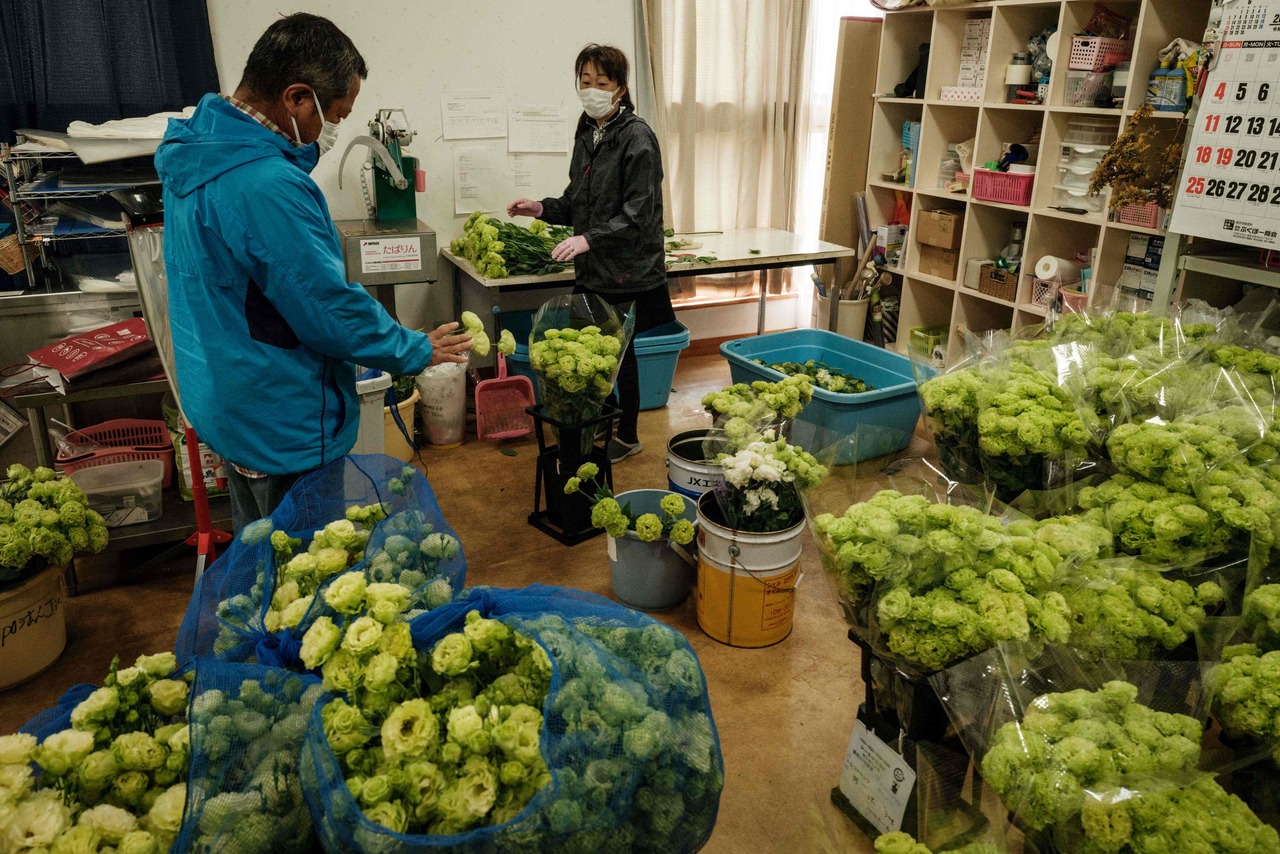 <p>Yukari Shimizu (R) and Hiroshi Kawamura (L) of Jin, a non-profit organisation which grows flowers in a number of greenhouses, take care of lisianthus flowers - some of which will be used for victory bouquets at the Tokyo 2020 Olympic Games - at a greenhouse on July 30, 2021 in Namie, a town in Fukushima prefecture which was badly damaged in the 2011 earthquake and tsunami and then evacuated due to the resulting nuclear disaster. (Photo by Yasuyoshi CHIBA / AFP)</p>
