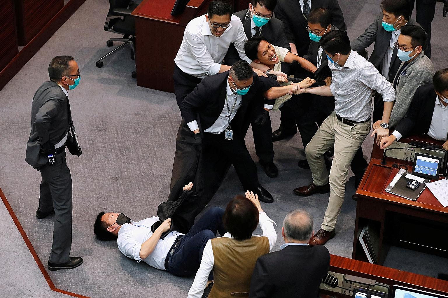 Pan-democratic legislator Eddie Chu Hoi-dick being hauled down by security officers and pro-government legislators during a House Committee meeting in Hong Kong yesterday.