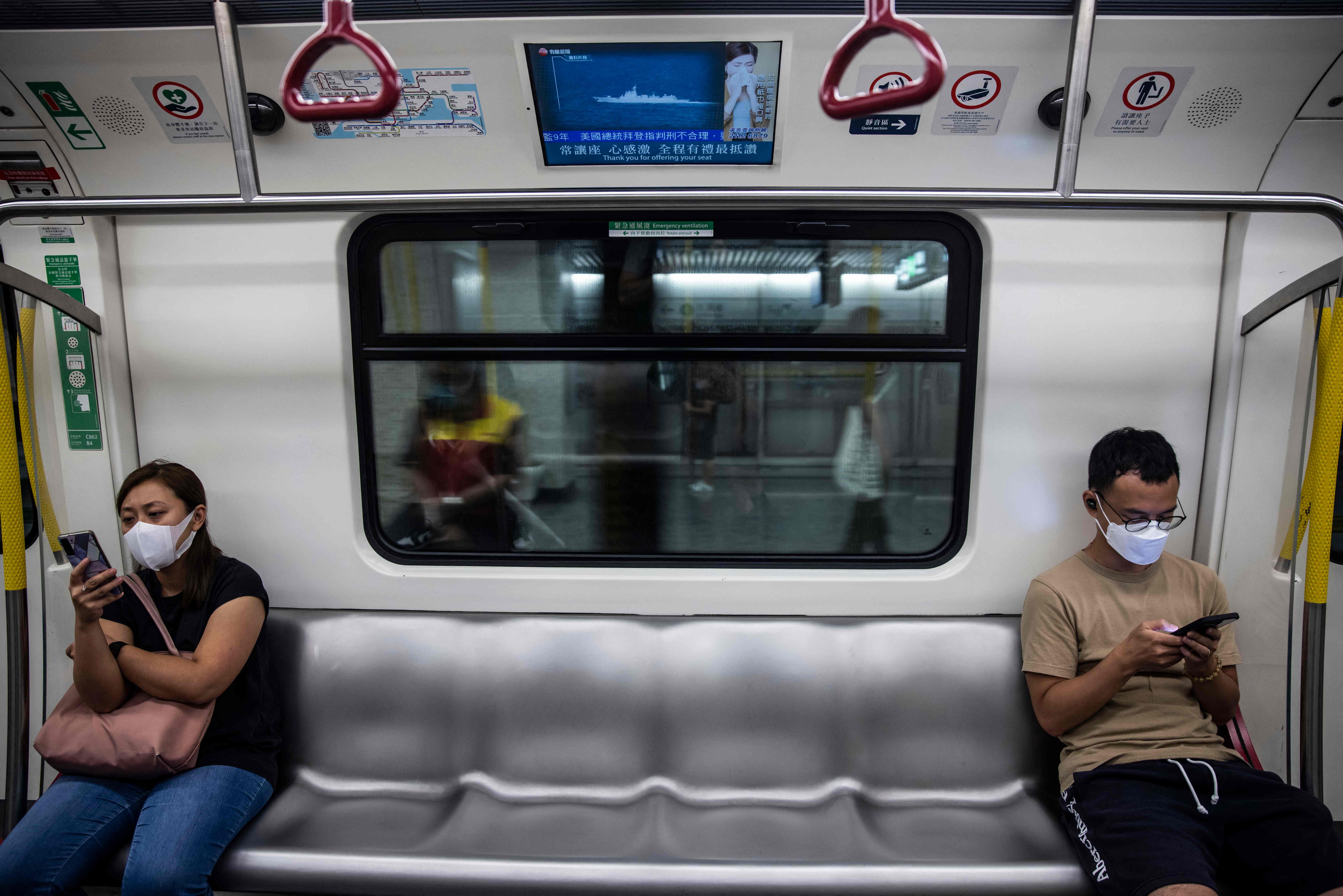 A television screen (top) on a train in Hong Kong last Friday showing military exercises being held by China around Taiwan.