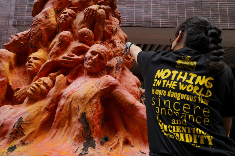 The artwork, of anguished human torsoes, is one of the few remaining public memorials in the city to remember the bloody crackdown that is a taboo topic in mainland China, where it cannot be publicly commemorated.