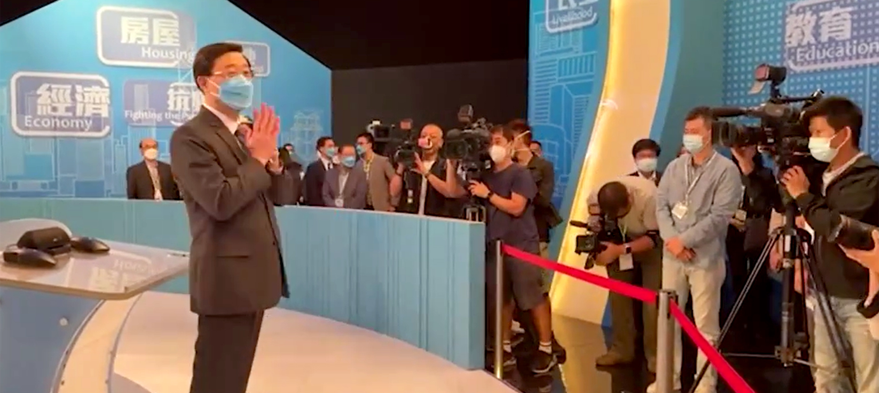 Sole Hong Kong chief executive candidate John Lee at a televised Q&A session, where he answered questions raised by members of the public and the media, on April 30, 2022.