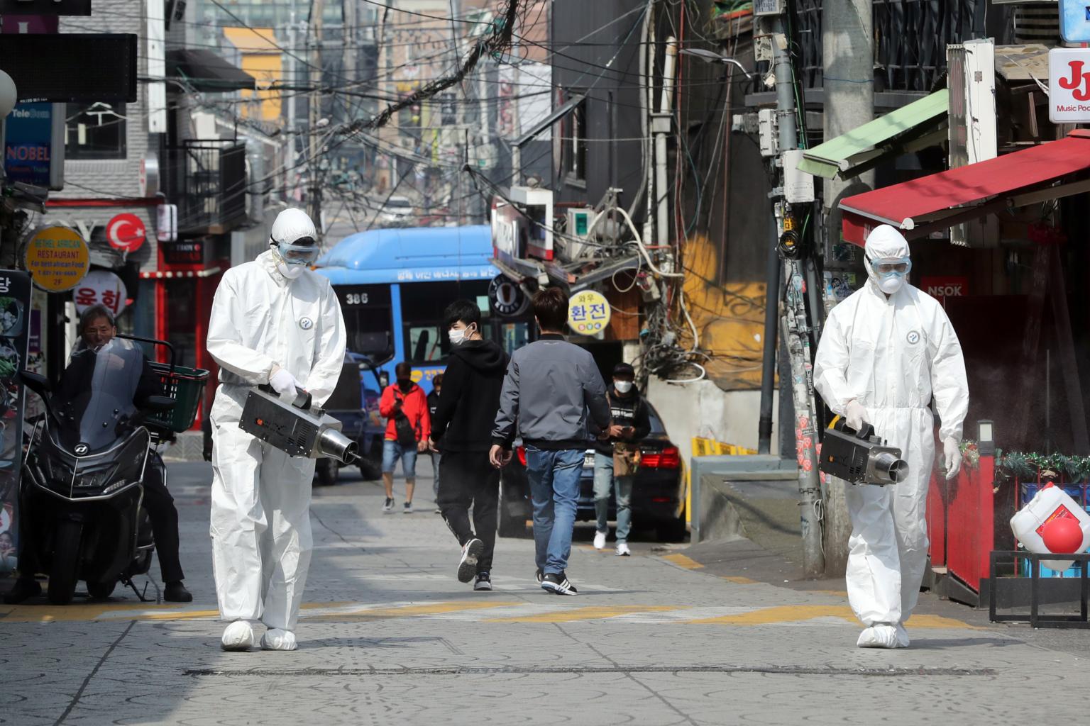Quarantine workers spraying disinfectant around nightspots in Itaewon, Seoul, on May 11, 2020.