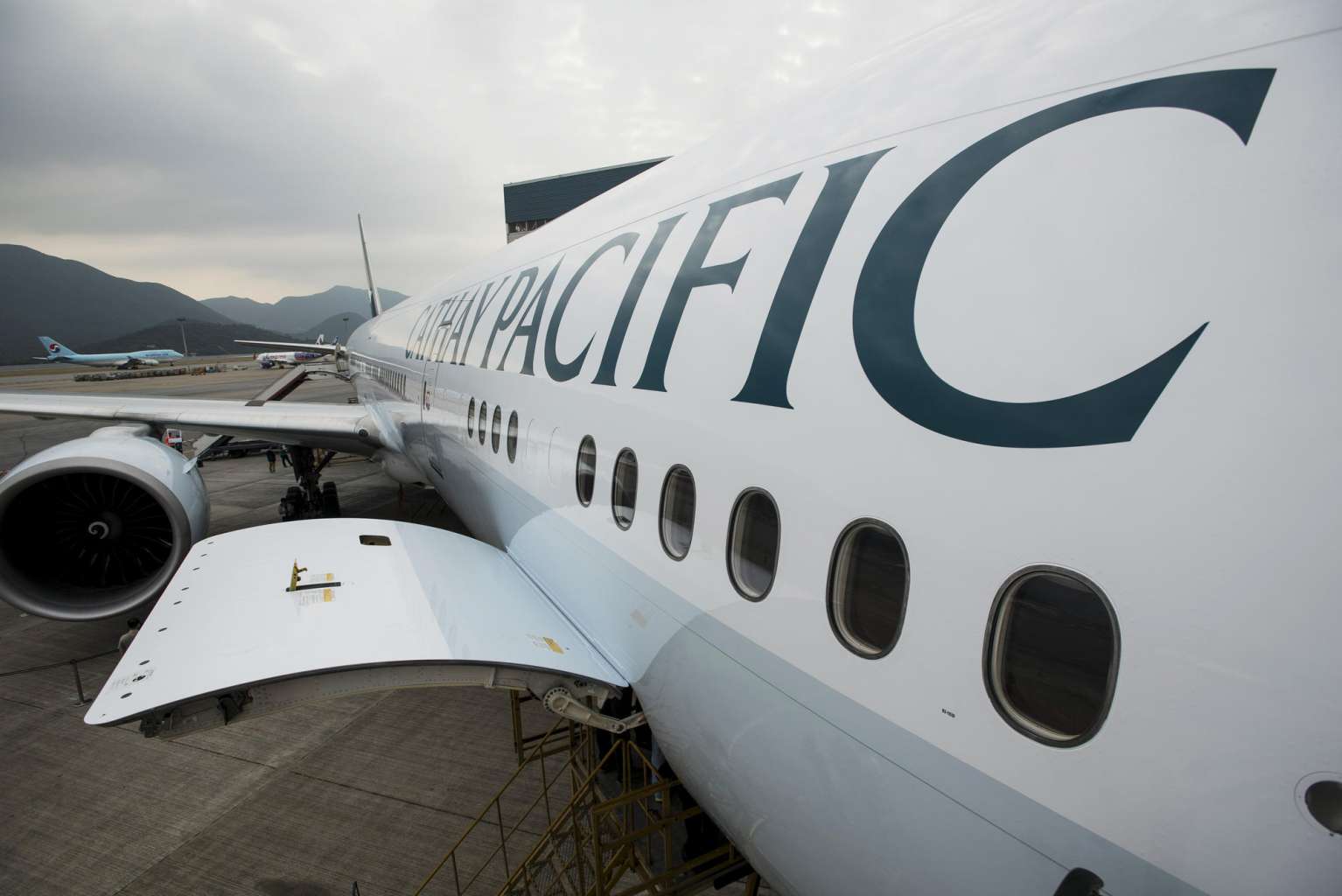 A Boeing 777-300 aircraft operated by Cathay Pacific Airways sitting on the tarmac at the Hong Kong International Airport.