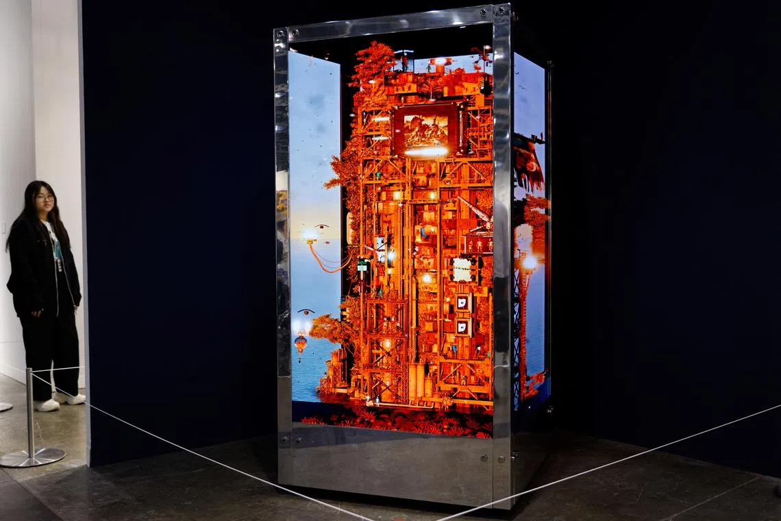 A woman looks at a kinetic sculpture “S.2122” by Beeple at the fair.