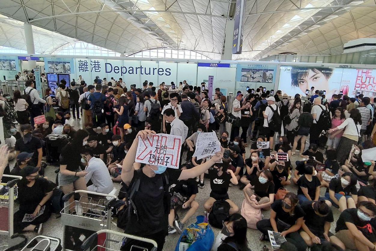 Protesters blocking departure gates at the Hong Kong airport as part of a demonstration on Aug 13, 2019.
