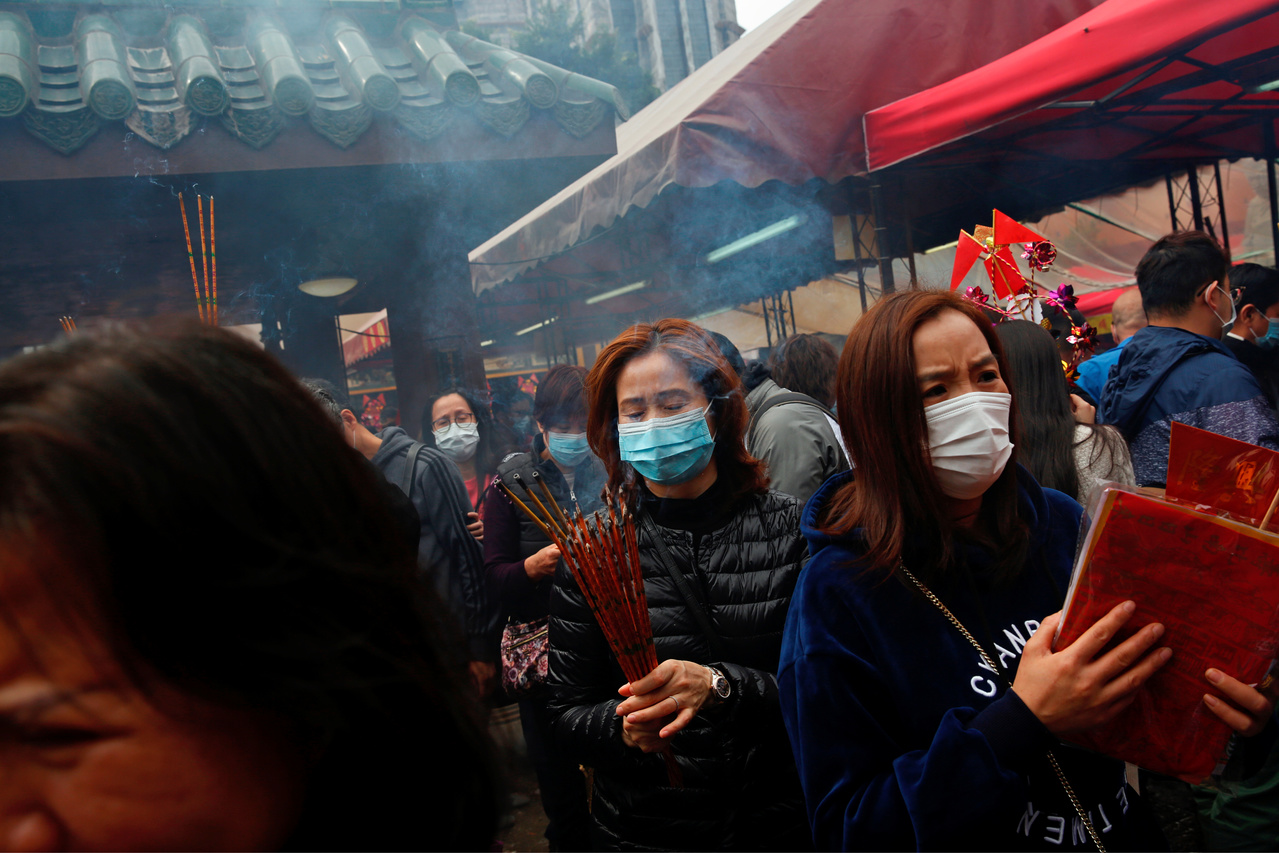 In a photo taken on Jan 26, 2020, worshippers wear masks as they make offerings of incense sticks during a Chinese New Year celebration at a temple in Hong Kong.