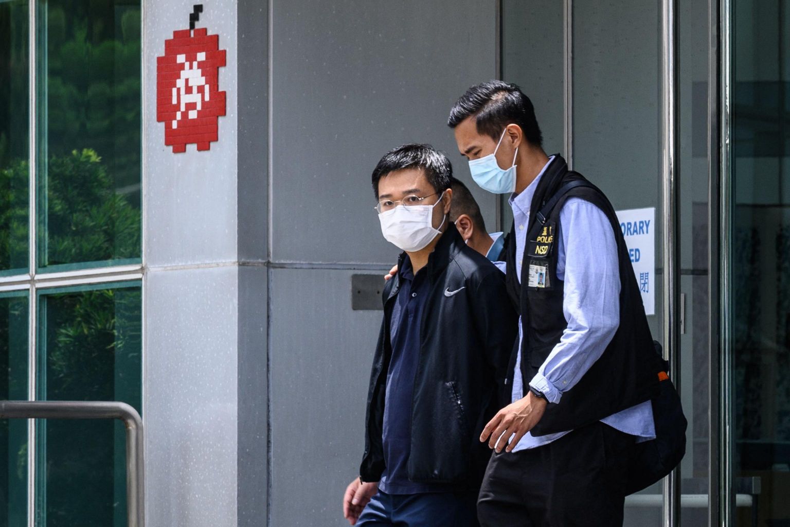 Apple Daily editor-in-chief Ryan Law being arrested at the newspaper's headquarters on June 17, 2021.