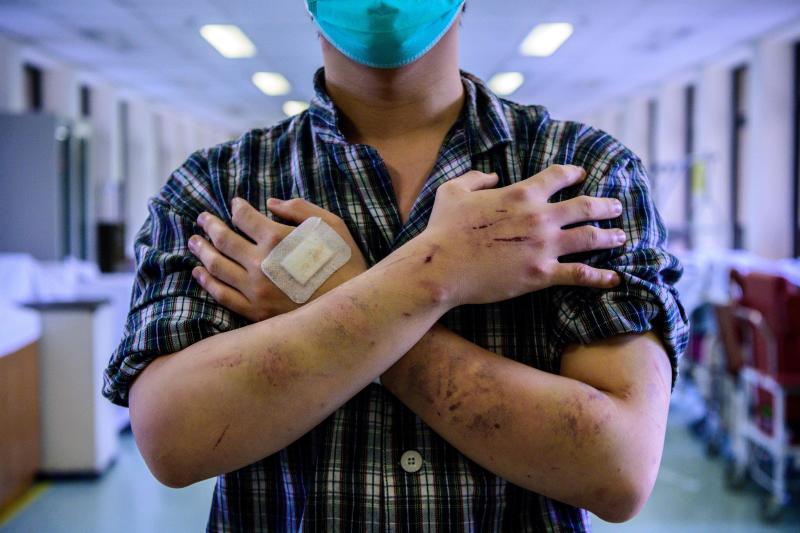 Mr So took off his shirt to showcase his wounds to AFP, revealing a patchwork of red welts and wounds that he said had been so painful that he had been unable to sleep on Sunday.