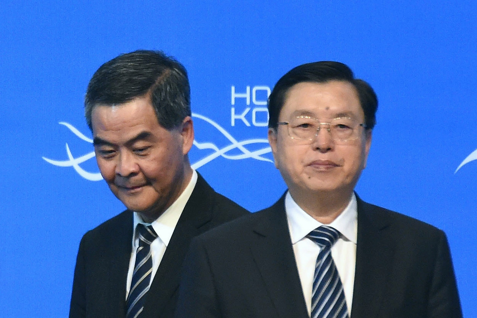 Hong Kong Chief Executive Leung Chun-ying (left) walks past Zhang Dejiang, while on stage as they open the Belt and Road Summit in Hong Kong.